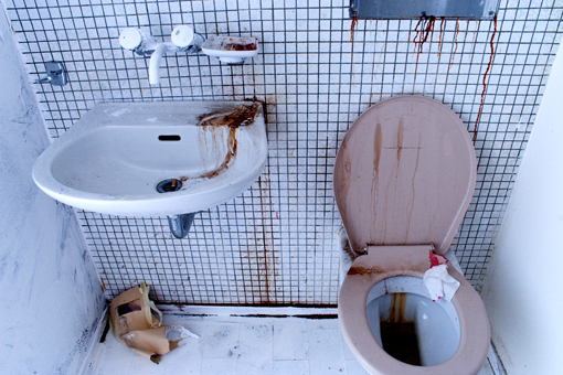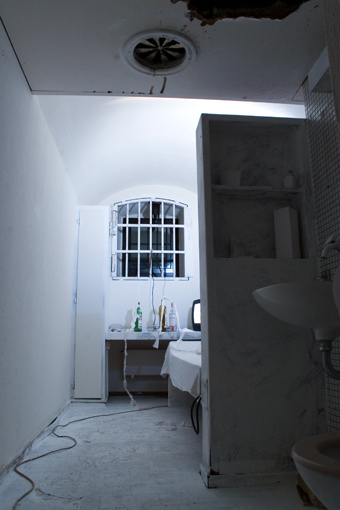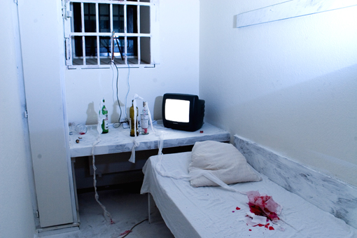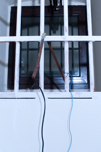 installation in situ, TV et antenne artisanale reliée aux barreaux, cocktails molotov, draps, cire, spot bleu